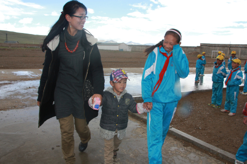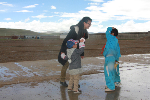 2007年8月援教期滿后,白覺(jué)措回到拉薩,在當(dāng)雄縣納木湖鄉(xiāng)中心小學(xué)任教。四千八百米的納木湖鄉(xiāng)中心小學(xué)是拉薩市海拔最高的學(xué)校。每到冬天,這里都會(huì)迎來(lái)大風(fēng)雪。而在大雪封山時(shí),蔬菜是運(yùn)不進(jìn)來(lái)的。所以,白覺(jué)措和其他老師還要利用休息的時(shí)間帶領(lǐng)學(xué)生們?cè)趯W(xué)校的高寒溫棚內(nèi)自己種菜,以備不時(shí)之需。白覺(jué)措淡淡得說(shuō)道:“這里的夏天是很美,冬天卻讓人受不了。而且夏天并不是天天都是風(fēng)和日麗,時(shí)不時(shí)還會(huì)來(lái)場(chǎng)冰暴。”正說(shuō)話間,豆大的冰雹就下起來(lái),“噼哩叭啦”打在窗戶上。白覺(jué)措急忙起身向外走去,因?yàn)檎滴顼垥r(shí)間,學(xué)生們正朝食堂走向。天冷地滑,怕學(xué)生摔倒白覺(jué)措拉著自己兩歲半的兒子,站在空地上,對(duì)著遠(yuǎn)處跑來(lái)的學(xué)生不停地喊道:“慢點(diǎn),慢點(diǎn),小心摔倒!……”。