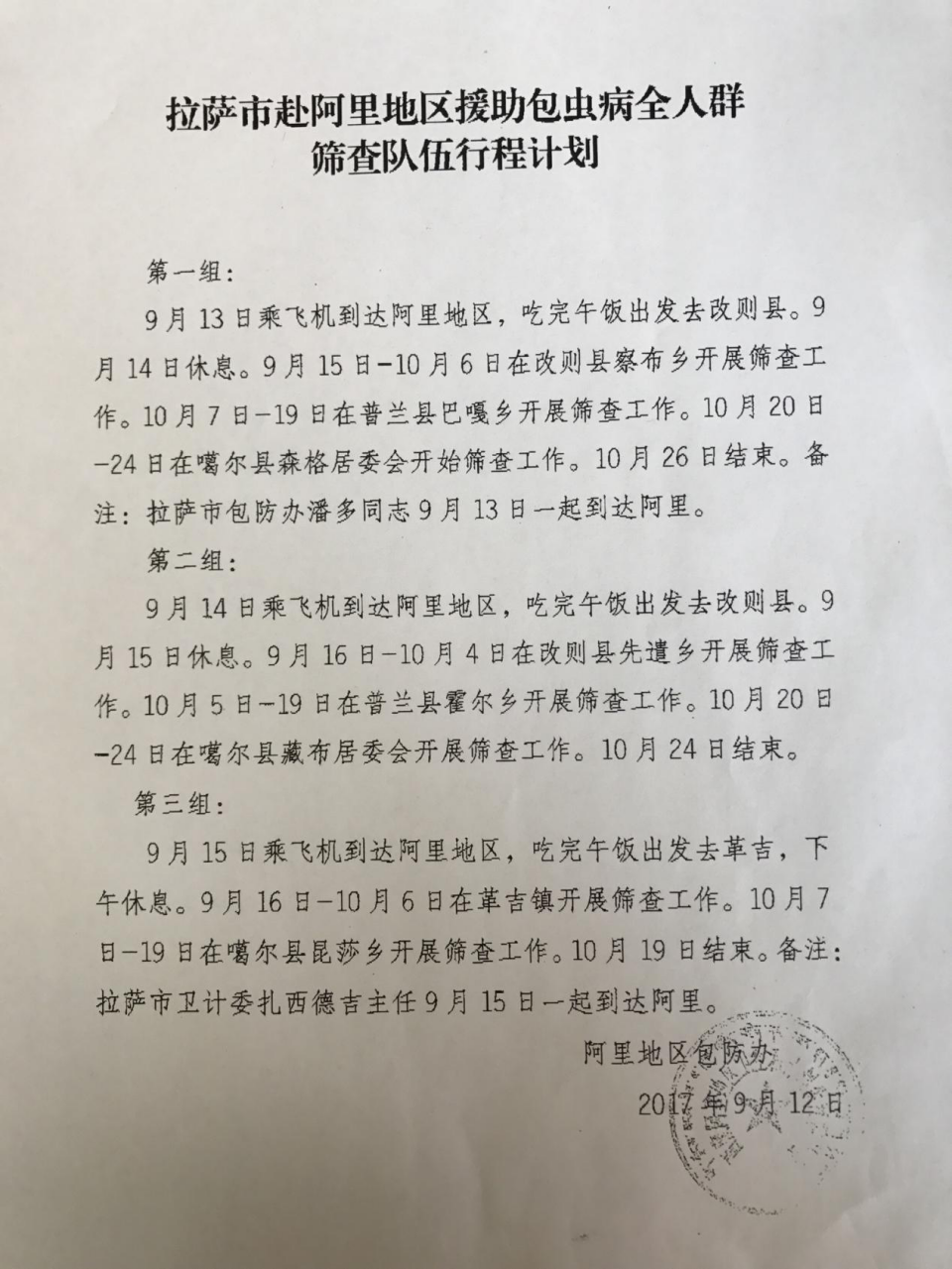 經(jīng)了解,此次包蟲(chóng)篩查工作,拉薩市衛(wèi)計(jì)委邀請(qǐng)并組織3支共18人的醫(yī)療小分隊(duì)。我院是第三組,分在阿里的革吉鎮(zhèn)和噶爾縣昆莎鄉(xiāng)兩個(gè)篩查點(diǎn),共將篩查3564人。另外兩組分別是改則縣察布鄉(xiāng)(2650人)和先遣鄉(xiāng)(2050人)。從分配工作計(jì)劃上看我組分配的篩查人員最多,人員也比較分散,給工作增加了難度,小組預(yù)計(jì)將9月17日~10月19日完成篩查工作。