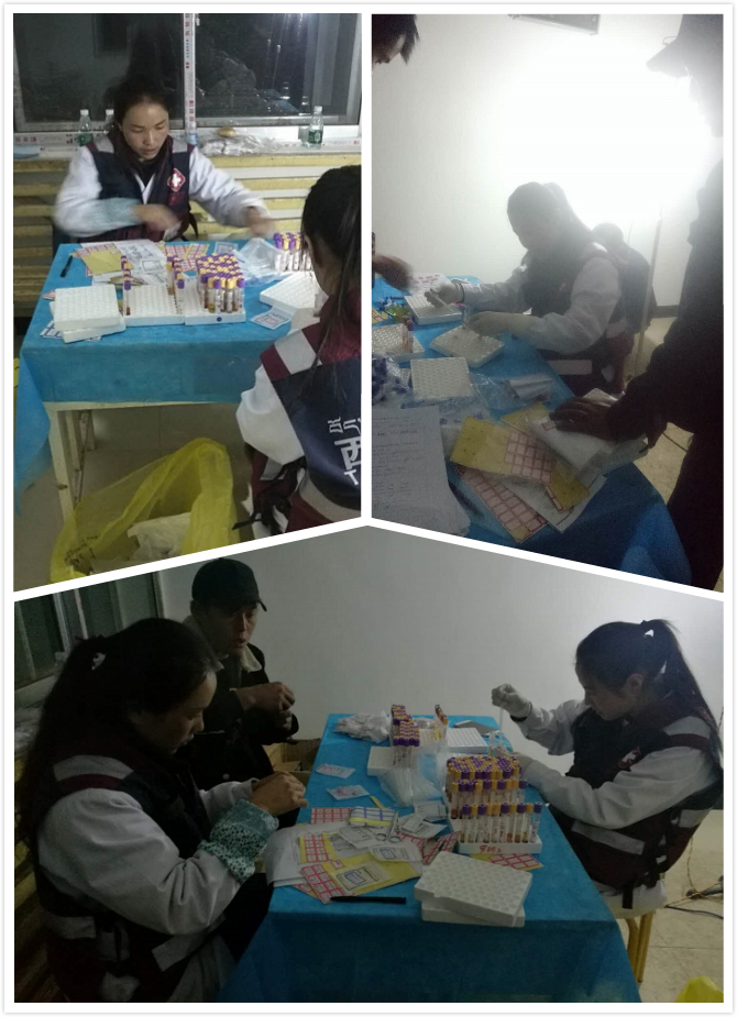 10月13日文布鄉(xiāng),衛(wèi)生院里一大早就擠滿了等待檢查的村民,格桑拉吉技師與劉亞美護(hù)士顧不上休息一直檢查到下午四點(diǎn),才匆匆吃了午飯,之后又繼續(xù)檢查,當(dāng)天做完最后一例檢查已接近晚上八點(diǎn)。由于人手不夠,劉亞美護(hù)士完成抽血后,在當(dāng)?shù)匦l(wèi)生院拉瓊老師與格桑拉吉技師的協(xié)助下對采集的血液進(jìn)行分離,一直工作到凌晨才結(jié)束。伴著夜色,格桑拉吉技師與劉亞美護(hù)士拖著疲憊的身體回到宿舍,來不及洗漱,倒在床上就睡著了。當(dāng)日,格桑拉吉組共篩查120例,陽性4例,疑似1例。