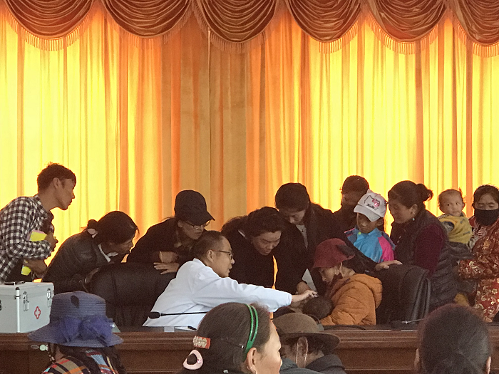 隨后,阜康義診隊對前來咨詢和檢查的牧民做了詳細(xì)的解答和初步的身體檢查。周健主治醫(yī)師負(fù)責(zé)測量血壓、了解老百姓的基本健康情況,唐宗青護(hù)士負(fù)責(zé)給牧民測血糖,瓊瑪副主任醫(yī)師和榮瑪鄉(xiāng)高海拔生態(tài)搬遷點醫(yī)務(wù)室的同志負(fù)責(zé)給老百姓發(fā)放藥品,工作在有條不紊中進(jìn)行。