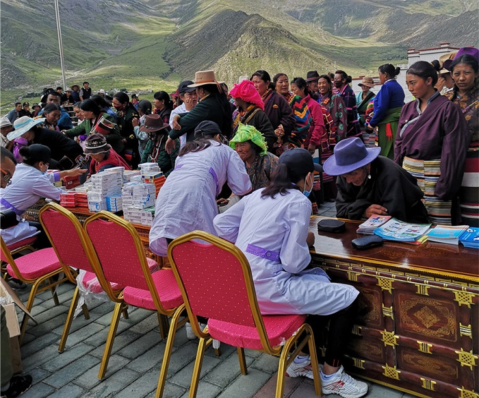 當(dāng)天上午,全國婦聯(lián)宣傳部、自治區(qū)婦聯(lián)、拉薩市婦聯(lián)、那曲市婦聯(lián)一行來到安置點(diǎn)為群眾贈送了藏漢雙語書籍。阜康義診工作隊也來到現(xiàn)場為安置點(diǎn)居民量血壓、檢查病情并詢問身體情況,耐心細(xì)致地為群眾分析病情、講解日常衛(wèi)生保健、合理用藥等衛(wèi)生常識,認(rèn)真解答關(guān)于常見病、多發(fā)病的預(yù)防診治及愈后注意事項。僅一個上午時間就為100余名安置點(diǎn)群眾開展了問診、聽診、答疑、測血壓和健康知識宣傳,免費(fèi)發(fā)放各類藥品價值4萬余元 。