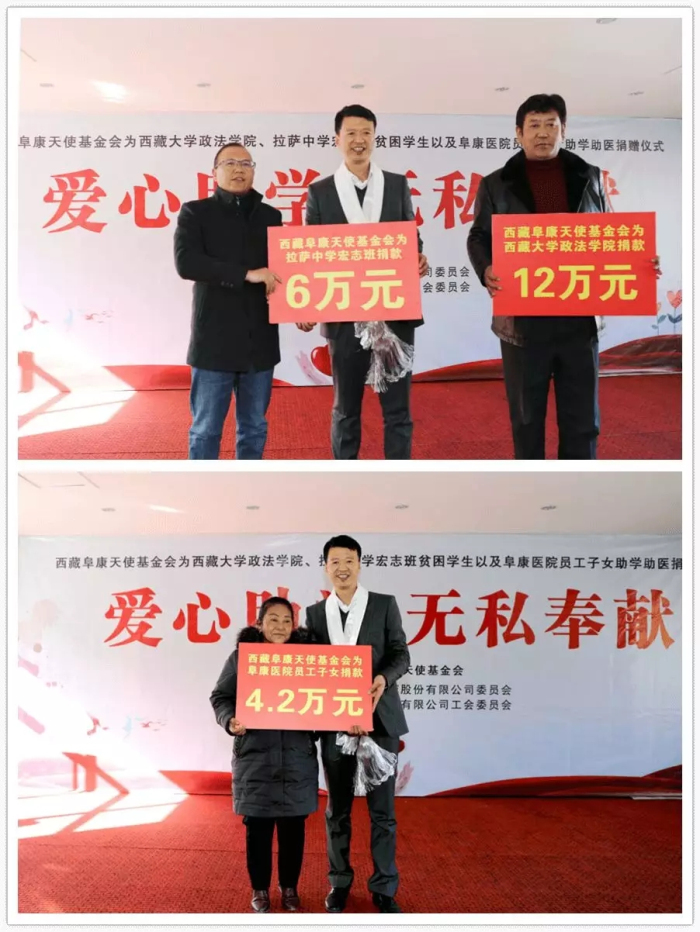本次捐贈儀式,西藏阜康天使基金會為西藏大學(xué)政法學(xué)院30名貧困學(xué)生,每人每年捐助4000元的生活補(bǔ)貼,總金額為120000元人民幣;為拉薩中學(xué)宏志班10名學(xué)生,每人每年6000元的生活補(bǔ)貼,總金額60000元人民幣;為阜康醫(yī)院內(nèi)部6名貧困員工的子女(4名助學(xué);2名助醫(yī))給予助學(xué)助醫(yī)補(bǔ)助,每人每年6000元,總金額36000元人民幣。為社會學(xué)生2名(1名高中生、1名大學(xué)生);每人6000元,共計(jì)12000元人民幣。此次捐贈總金額為228000元人民幣。此外阜康醫(yī)院還分別為西藏大學(xué)政法學(xué)院20名和拉薩中學(xué)20名身體存在健康隱患的學(xué)生開通綠色體檢通道。