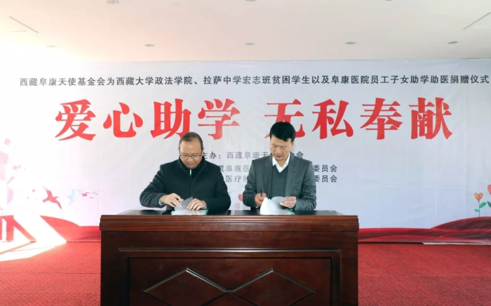西藏阜康天使基金會理事長、西藏阜康醫(yī)療股份有限公司黨委書記、董事長王斌與拉薩中學(xué)校長陳飛簽訂捐助協(xié)議