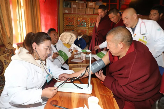 2020年1月19日,受西藏阜康醫(yī)療股份有限公司黨委書記、董事長(zhǎng)王斌的委托,在春節(jié)前夕,為甘丹寺僧侶們送醫(yī)送健康,送去阜康新年的祝福。西藏阜康醫(yī)院總院長(zhǎng)寧曉帶領(lǐng)阜康醫(yī)院心腦血管院區(qū)及體檢中心專家義診組6名隊(duì)員來(lái)到甘丹寺,為全寺僧侶發(fā)放、解讀體檢報(bào)告,免費(fèi)測(cè)血壓、血糖、氧飽和度,并發(fā)放常見(jiàn)疾病藥品(共計(jì)12000余元)。