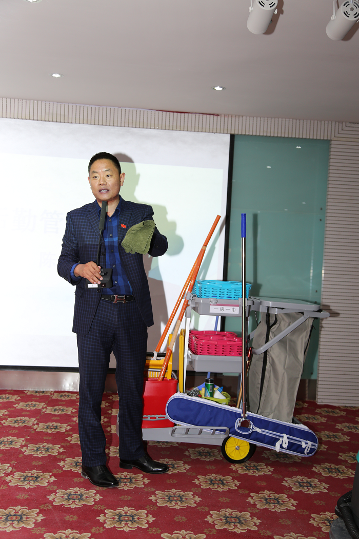 隨后,陳總運(yùn)用圖文并茂的方式,對后勤管理各班組工作內(nèi)容展開了詳細(xì)全面的培訓(xùn),包括倉庫管理、保潔六步工作法、各類區(qū)域的打掃方法、維修組接報修管理、常規(guī)設(shè)備操作規(guī)程、安全作業(yè)管理以及保安組崗位要求、設(shè)備準(zhǔn)備情況和秩序維護(hù)等內(nèi)容。
