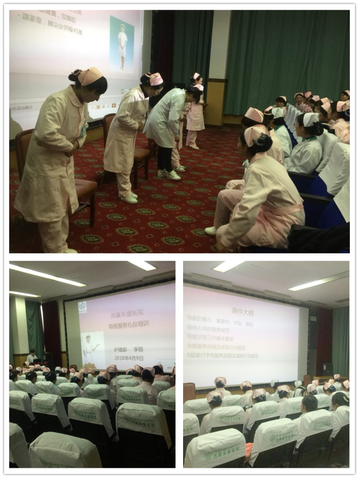 2018年4月9日下午7點,西藏阜康醫(yī)院、西藏阜康醫(yī)院婦產(chǎn)兒童分院、西藏阜康醫(yī)院心腦血管分院三家醫(yī)院護理部組織開展了導(dǎo)醫(yī)服務(wù)禮儀培訓(xùn),培訓(xùn)內(nèi)容涵蓋了導(dǎo)醫(yī)的儀容儀表、站姿、坐姿、行姿、手勢引領(lǐng)病人、電話禮儀、文明用語等,參加培訓(xùn)的導(dǎo)醫(yī)人數(shù)為34人。