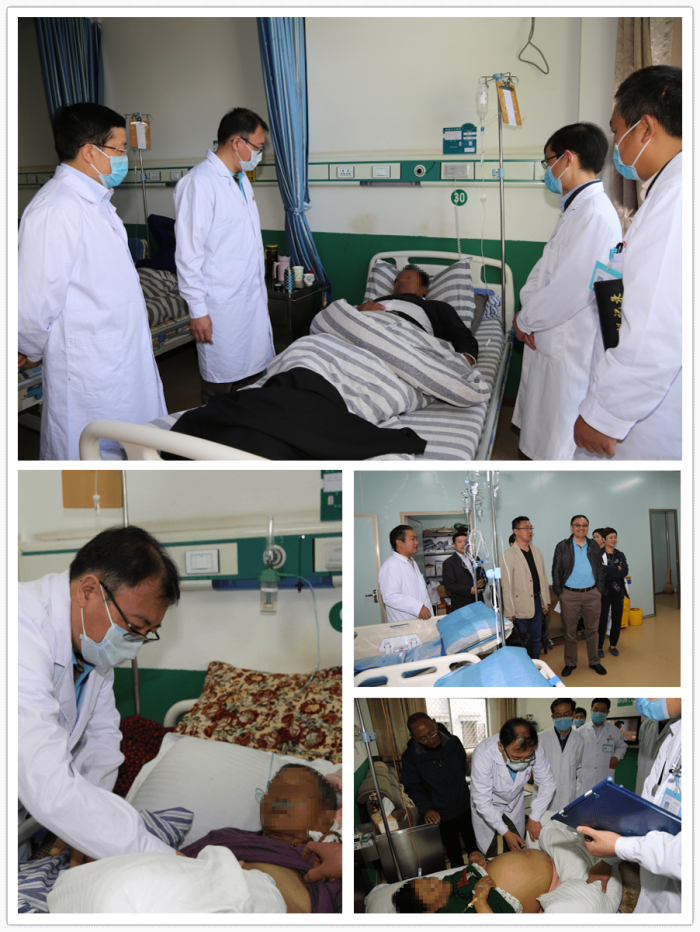 在阜康醫(yī)院住院部,周平紅教授一行換上工作服和阜康醫(yī)院消化內(nèi)科醫(yī)護(hù)人員一起查房。在44號尼珍的病床前,周平紅教授詳細(xì)詢問病人的生理、病理指標(biāo),阜康醫(yī)院醫(yī)護(hù)人員一一詳細(xì)回答。之后,周平紅教授走到病床前對患者的體征狀況進(jìn)行了仔細(xì)檢查,并向家屬詢問病人的實時病況。周平紅教授還來到89歲的患者扎西、離退休人員格桑的病床前,詢問了病人的各項指標(biāo)并仔細(xì)進(jìn)行了體征檢查。
