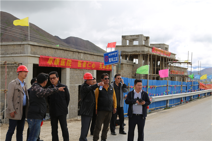 2018年了8月9日,受阜康邀請,西藏自治區(qū)政協(xié)副主席、區(qū)工商聯(lián)主席、區(qū)總商會會長阿沛·晉源,拉薩大昭寺管家洛桑,西藏自治區(qū)社會科學(xué)院原處長次旺仁青,西藏阜康醫(yī)療股份有限公司黨委書記、董事長王斌,西藏阜康醫(yī)療股份有限公司黨委副書記、副總經(jīng)理陳彬,西藏阜康醫(yī)院名譽(yù)院長嘎布,阜康生殖醫(yī)學(xué)中心實(shí)驗(yàn)室主任劉鋒,阜康體檢中心主檢師瓊瑪,阿沛·晉源主席秘書旦增一行早上8點(diǎn)從拉薩出發(fā),一路顛簸馳騁于下午2點(diǎn)50分許抵達(dá)那曲地區(qū)嘉黎縣夏瑪鄉(xiāng)。聽說晉源主席要來視察衛(wèi)生院的建設(shè)工作,嘉黎縣縣長吾金不顧受傷的左腿帶領(lǐng)當(dāng)?shù)馗刹咳罕娫缭绲群蛟谙默斷l(xiāng)衛(wèi)生院建設(shè)現(xiàn)場。