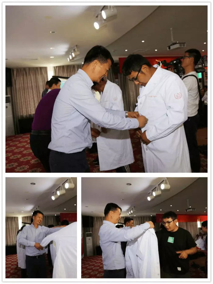 會(huì)議舉行了換裝儀式。王斌、陳彬、孫貴林、李君、李勇、何靜等院領(lǐng)導(dǎo)為醫(yī)師代表?yè)Q上整潔的新式白大褂,向醫(yī)師代表贈(zèng)送了首屆醫(yī)師節(jié)紀(jì)念禮物;汪麗、李勇、徐勝柱、扇敏娜、李生隆等一起為全體醫(yī)師分發(fā)慶祝蛋糕,讓每一位在場(chǎng)醫(yī)務(wù)人員品嘗到濃濃的節(jié)日甜蜜。