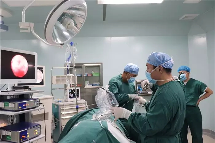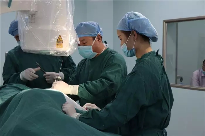 13:00時,徐鑫一行來到病房,對即將接受手術(shù)的患者進行術(shù)前評估,看過核磁共振和CT檢查資料,通過交流討論最終確定了手術(shù)方案。13:35分患者被推進手術(shù)室,本次手術(shù)由徐鑫和阜康醫(yī)院骨科醫(yī)師李延軍共同完成。手術(shù)運用BEIS技術(shù),在定位階段專家們多次透視確保儀器直達(dá)患處,以確保摘除髓核準(zhǔn)確無誤、減少患者創(chuàng)傷。髓核摘除后,患者疼痛麻木感隨即消失,手術(shù)圓滿成功,16:25分患者被推出手術(shù)室,專家嚴(yán)謹(jǐn)細(xì)致的作風(fēng)以及精湛的技術(shù)贏得醫(yī)務(wù)人員的掌聲。椎間孔鏡微創(chuàng)手術(shù)的重點在于透視定位,只有精準(zhǔn)定位才能保證準(zhǔn)確摘除髓核,減少患者疼痛與創(chuàng)傷。