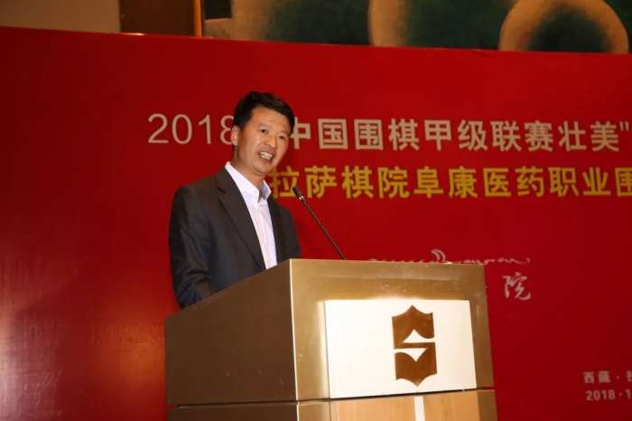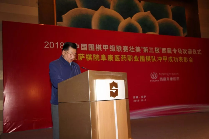 西藏自治區(qū)政府副主席甲熱·洛桑旦增代表自治區(qū)人民政府對各位嘉賓的到來表示熱烈歡迎。他說圍棋是一切棋類運動的鼻祖,是中華民族優(yōu)秀傳統(tǒng)文化的瑰寶,融合了軍事、哲學(xué)、詩詞等多種文藝形式,是中華民族幾千年來智慧的結(jié)晶,也是對人類文明的重要貢獻。在建設(shè)社會主義文化強國、體育強國、實現(xiàn)中華民族偉大復(fù)興的中國夢進程中,圍棋這樣一項由文化融進體育的智慧運動承擔著重要的歷史使命。拉薩棋院西藏阜康醫(yī)藥職業(yè)圍棋隊沖甲成功是西藏體育發(fā)展的重大突破,也是社會力量推動體育事業(yè)發(fā)展的典范。為此我代表自治區(qū)人民政府對西藏阜康醫(yī)藥職業(yè)圍棋隊沖甲成功表示熱烈祝賀,對社會各界支持西藏體育事業(yè)發(fā)展表示感謝,自治區(qū)政府將加快推進體育事業(yè)改革、做強做大體育產(chǎn)業(yè),促進全區(qū)體育事業(yè)再上臺階。祝愿2018年中國圍棋甲級聯(lián)賽壯美“第三極”西藏專場取得成功,祝愿西藏阜康醫(yī)藥職業(yè)圍棋隊在明年的甲級聯(lián)賽中取得更好成績。