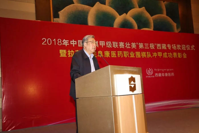 中國圍棋協(xié)會主席林建超將軍在致辭中表示,拉薩棋院西藏阜康醫(yī)藥職業(yè)圍棋隊沖甲成功是全國圍棋運動中的一件大事。它首先改變了當代中國圍棋運動的版圖,雪域高原第一次在中國圍棋甲級聯(lián)賽中占有了一席之地;其次,這次沖甲實現(xiàn)了西藏體育發(fā)展的一次突破,使西藏在全國性的體育賽事中,擁有了第一支甲級職業(yè)隊伍;第三,本次沖甲成功,為圍棋文化和藏式棋類文化的交融促進提供了一個很好的契機,為西藏地區(qū)棋文化的發(fā)展起到了很好的推動作用。這項成績來之不易,首先應(yīng)該歸功于自治區(qū)各級黨委、政府的重視,尤其是齊扎拉主席長期以來對包括圍棋、藏式棋等棋類活動的支持,有效促進了這項中華民族優(yōu)秀傳統(tǒng)文化在雪域高原的普及與發(fā)展,這是與習近平總書記在十九大報告中提出的戰(zhàn)略目標相一致的。