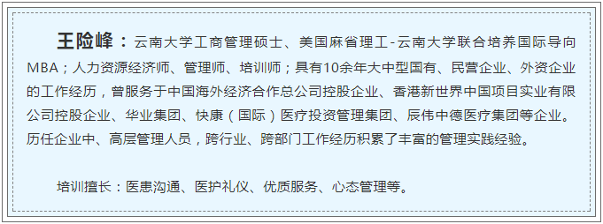 王險峰以“為什么來培訓”開題,對本次培訓的目的與意義進行了說明,調動了在場員工學習積極性。接下來他對“規(guī)范醫(yī)療”、“安全醫(yī)療”、“效率醫(yī)療”、“溫度醫(yī)療”四種醫(yī)療模式進行區(qū)別解讀,以加深員工對“優(yōu)質醫(yī)療服務”的理解。王險峰介紹,北京市朝陽區(qū)桓心腫瘤醫(yī)院院長丁劍曾說“無溫度,不醫(yī)療。溫度醫(yī)療是整個非公醫(yī)療行業(yè)的出路”,阜康作為民營醫(yī)療機構,開展“溫度醫(yī)療”,提供“優(yōu)質服務”是發(fā)展壯大的重要途徑。接下來他就如何營造“溫度醫(yī)療”進行展開論述,分別從“什么是服務和優(yōu)質服務”、“職業(yè)化態(tài)度與服務能力”、“與患者家屬建立良好關系”、“語言和非語言能力及傾聽能力”、“談判技巧與化解沖突能力”、“禮儀行為規(guī)范”六個方面進行闡釋。