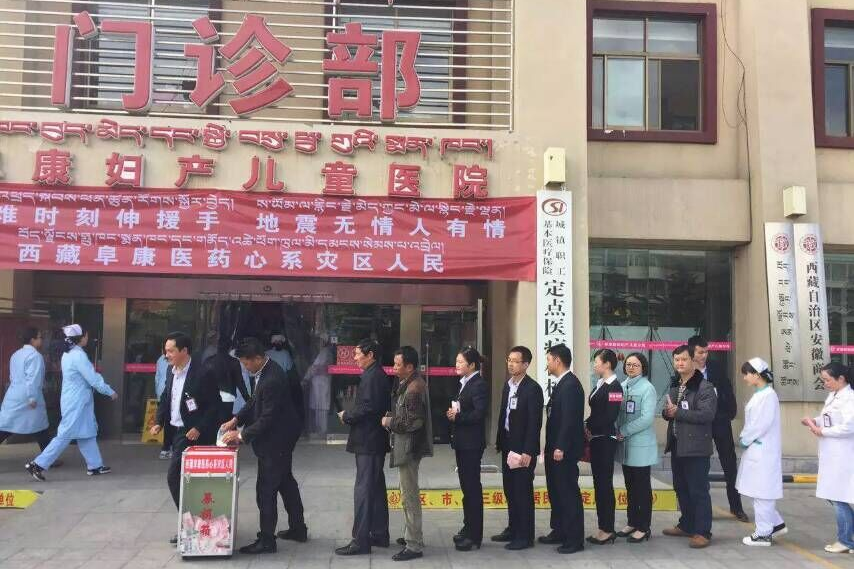 在得知尼泊爾地震后第一時間,阜康醫(yī)藥發(fā)展有限公司攜西藏阜康醫(yī)院、阜康醫(yī)院婦產(chǎn)兒童分院、阜康醫(yī)院心腦血管分院、阜康(國際)健康體檢中心以及旗下各大藥房舉行了災(zāi)區(qū)捐款儀式。