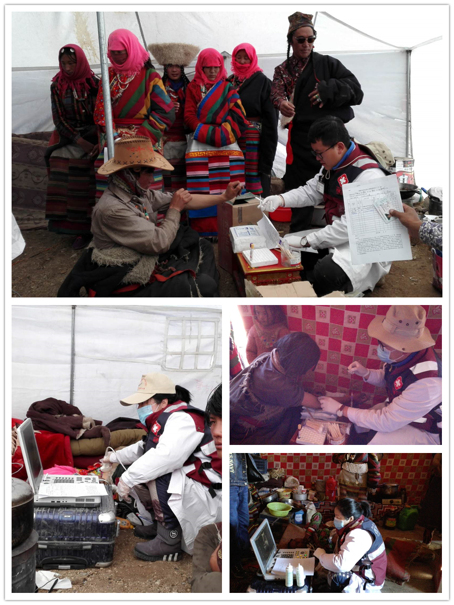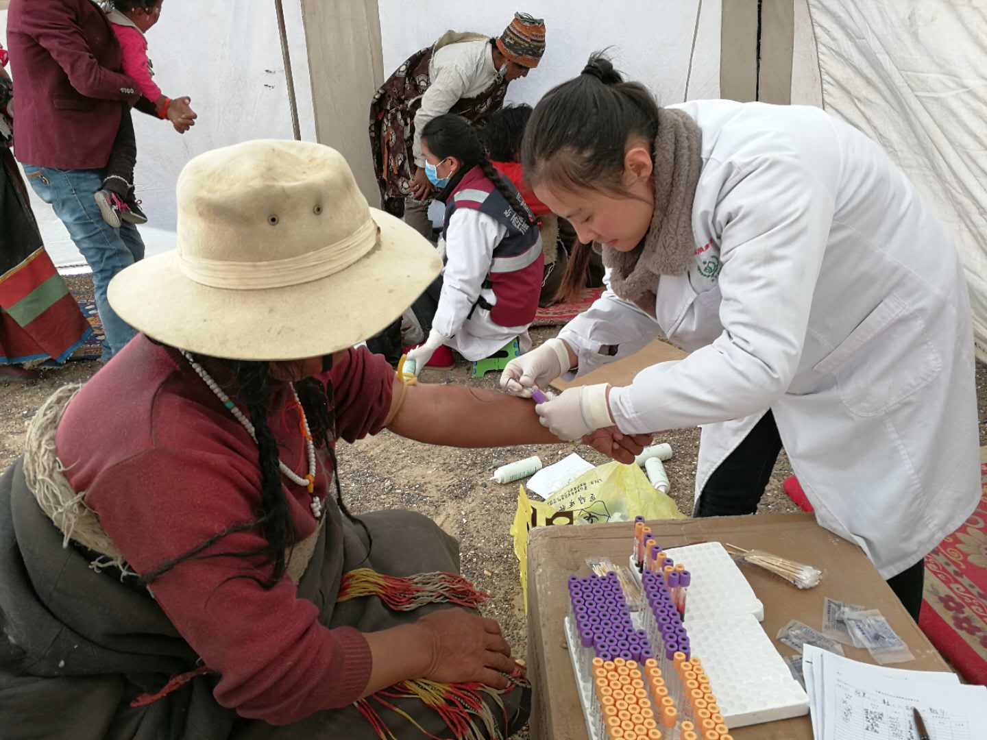 格桑拉吉技師與劉亞美護(hù)士隨同當(dāng)?shù)匦l(wèi)生院拉瓊老師前往文布鄉(xiāng)夏瑪村牧區(qū)深處,由于前往的路途顛簸、含氧量稀薄,醫(yī)療隊(duì)的隊(duì)員都出現(xiàn)不同程度的頭暈惡心,但他們見到焦急等待的牧民后,不顧舟車勞頓,克服身體的不適,迅速進(jìn)入臨時(shí)搭建的帳篷開始為牧民篩查。篩查結(jié)束后,當(dāng)隊(duì)員們要離開時(shí),夏瑪村村長及村民站在車旁為我們送行,嘴里還不停地說著:門巴 突及其,扎西德勒!”(藏話:謝謝大夫!吉祥如意!)