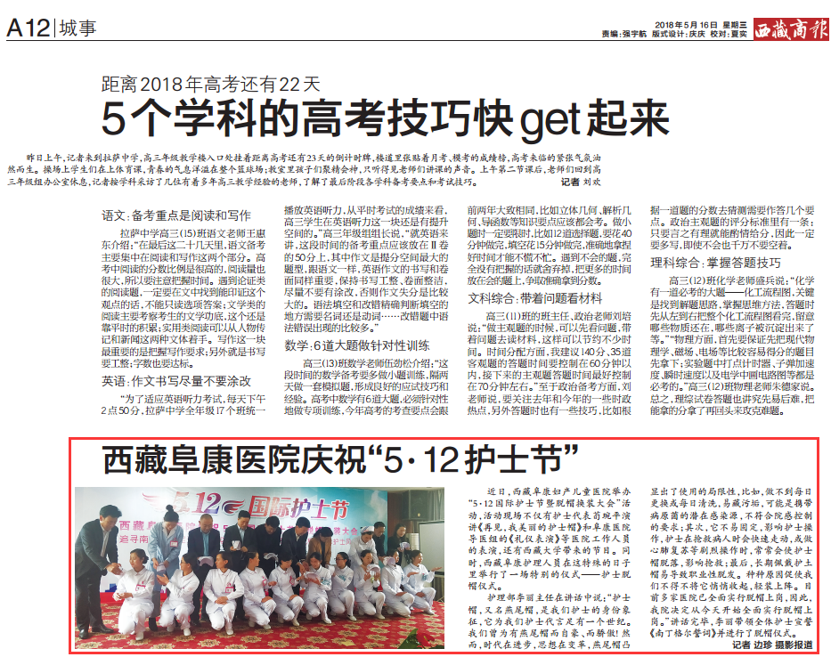 近日,西藏阜康婦產(chǎn)兒童醫(yī)院舉辦“5·12國際護(hù)士節(jié)暨脫帽換裝大會(huì)”活動(dòng),活動(dòng)現(xiàn)場不僅有護(hù)士代表荀琬平演講《再見,我美麗的護(hù)士帽》和阜康醫(yī)院導(dǎo)醫(yī)組的《禮儀表演》等醫(yī)院工作人員的表演,還有西藏大學(xué)帶來的節(jié)目。同時(shí),西藏阜康護(hù)理人員在這特殊的日子里舉行了一場特別的儀式——護(hù)士脫帽儀式。