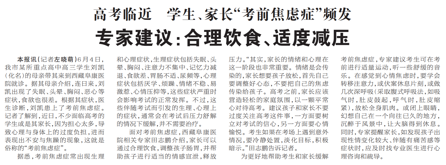 面對考前焦慮癥,西藏阜康醫(yī)院相關專家田志鵬介紹,家長可以通過合理飲食,調(diào)整孩子腸胃,并幫助孩子進行適當?shù)那楦行?,釋放壓力?ldquo;其實,家長的情緒和心理在這一階段也非常重要。情緒是會傳染的,家長想要孩子放松,首先自己要調(diào)整好心態(tài),不要把自己的焦慮傳染給孩子。高考之前,家長應該營造輕松的家庭氛圍,以一顆平常心對待高考。建議孩子和家長不要過度關注高考這件事,一方面要樹立對考試的信心,另一方面要心情愉悅??忌绻诳紙錾嫌龅揭馔馇闆r,要冷靜處置,淡化目標,積極暗示。”田志鵬告訴記者。