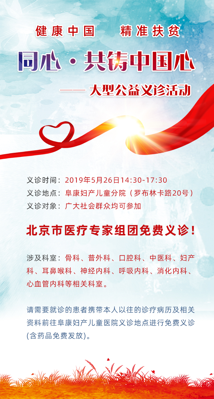 經(jīng)西藏自治區(qū)政府的大力支持與協(xié)調(diào),“同心·共鑄中國心”大型公益義診活動于5月26日14:30-17:30在阜康婦產(chǎn)兒童醫(yī)院開展,此活動由中共中央統(tǒng)戰(zhàn)部指導,助力“健康中國”“精準扶貧”國家戰(zhàn)略,促進“邊疆民族”地區(qū)醫(yī)療衛(wèi)生事業(yè)發(fā)展,是以疾病救治為核心進行的大規(guī)模定點、定向主題公益活動。