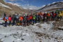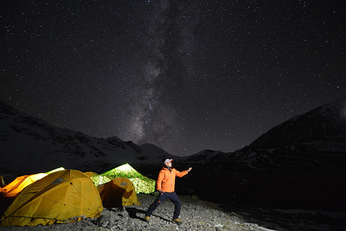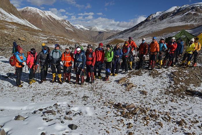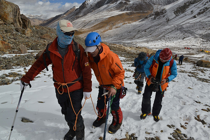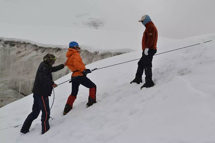 在海拔5500米處的雪線位置,教練們,選擇了一處較為平緩的雪坡,作為大本營,在這里對隊員們進行登頂前的指導訓練。指導隊員們使用上升器與下降器,體驗穿著高山靴帶著冰爪走路的感覺,教練們在這里認真介紹技術要領,并耐心解答隊員們提出的各種問題。休息之余大家都躲在帳篷里,有說有笑,完全消除了屋外雪山的寒冷。有從內地來的隊友,因高原反應,頭疼難忍,張洪就幫他們一一按摩推拿,緩解疼痛,大家就像一家人,其樂融融。