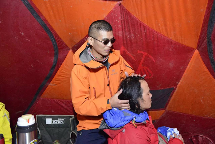 對于專業(yè)技術裝備的使用,張洪的接受能力也更強,很快就能完全獨立并且熟練操作這些裝備。張洪說:“我主要的問題就是看不到,不知道前邊的方向和哪條路線是安全的。但是這些問題都不是問題,攀登的時候會有一條安全繩,看不到但是卻能摸得到,沿著這條繩子往上都是安全的,我只要沿著它一步一步往上攀登,就能登上山頂。話聽著很簡單,但還是很難想象如此陡峭的山峰,如此厚重的積雪,一個盲人要克服多少困難才能登頂。”