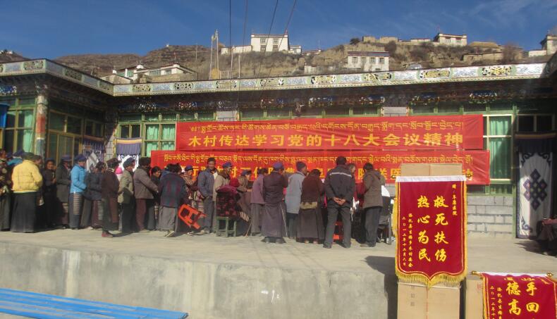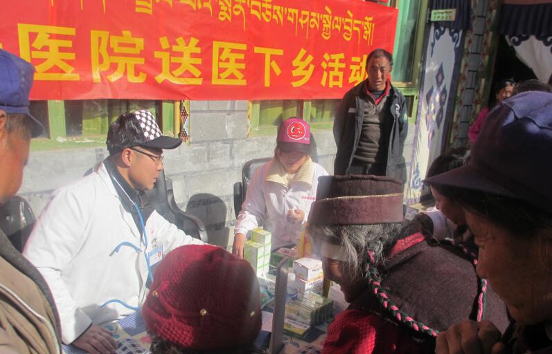 當(dāng)?shù)氐鸟v村干部,生格鄉(xiāng)政府、生格鄉(xiāng)衛(wèi)生院的領(lǐng)導(dǎo)接待了我們,得知我們趕路沒來得及吃早餐,特意煮了粥,炒了雞蛋和僅有的幾顆青菜。在他們的組織下,木村的百姓在村委會的院子里排起了長長的候診隊(duì)伍。院子里擺好了桌子、凳子,算是簡易的診斷臺,我負(fù)責(zé)測血壓、了解病情,護(hù)士小楊負(fù)責(zé)發(fā)藥,心電圖和B超由小張負(fù)責(zé)做,當(dāng)?shù)匦l(wèi)生院的吳金院長,以及醫(yī)生達(dá)次給我們當(dāng)翻譯。