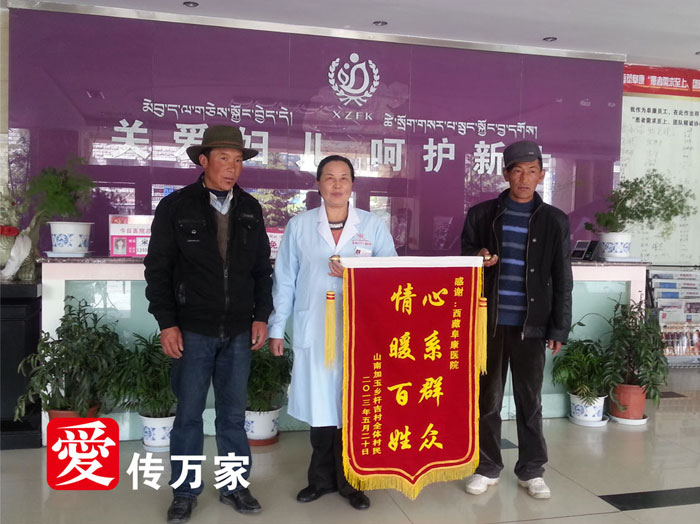 2013年5月22日阜康婦產(chǎn)兒童醫(yī)院門診大廳,山南加玉鄉(xiāng)桿吉村的塔杰書記激動地握著呂果梅院長的手,不停地說著感謝的話,他的身邊站著桿吉村的扎西村長,村長手上拿著一面錦旗,錦旗上面寫著“心系群眾 情暖百姓”。
