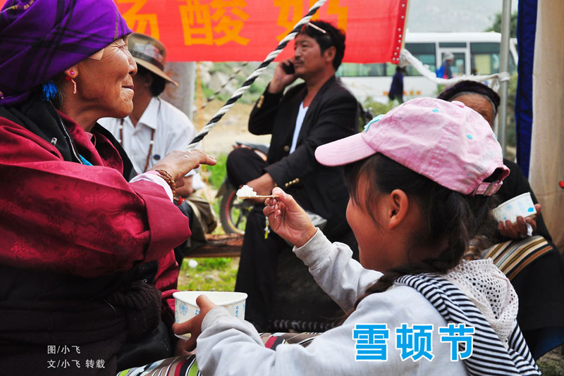 雪頓節(jié),是西藏最隆重的節(jié)日,千千萬萬的佛教徒從全世界涌向拉薩,以最虔誠的心、一步個頂禮膜拜,朝拜至高無上的佛祖。佛教信徒們到山上去修行,修行完畢時家里的親人帶著酸奶到山上去迎接他們,在回家的路上人們吃酸奶、跳舞、唱歌。