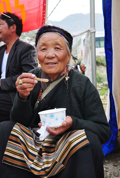 藏戲演出為另一重頭戲。從雪頓節(jié)的第二天開始,在羅布林卡及宗角祿康公園內(nèi),藏戲隊(duì)伍每天不停歇地從上午11點(diǎn)一直唱到暮色降臨。據(jù)說,因時間有限,這已經(jīng)是提取劇目中的精華部分,否則一出戲會唱上幾天。表演者自得其樂,觀賞者更是樂此不疲??▔|鋪在草地上,親朋好友閑適地圍坐在一起,擺上一路背來的青稞酒、酥油茶,還有自己做的各種藏式點(diǎn)心。很多藏民一邊聽著藏戲,一邊搖著手中的轉(zhuǎn)經(jīng)筒,或是捻著佛珠,臉上露出幸福的微笑。
