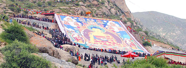 2013年的雪頓節(jié)于8月6日至8月12日在拉薩舉行。每年雪頓節(jié),晢蚌寺后山的展佛儀式都是一場重頭戲。盛大的展佛結束以后,才是羅布林卡的藏戲、歌舞表演,然后每家每戶吃酸奶。位于晢蚌寺后山腰上的巨幅釋迦牟尼唐卡畫像至今已有500多年歷史,高40米、寬34米。這幅由金粉、銀粉和珊瑚粉等繪成的巨型唐卡,平日深藏于寺院內(nèi),只有在雪頓節(jié)期間才在半山腰上以“曬佛”的行式展示在人們面前。這一藏傳佛教的盛事吸引了來自五湘四海的信眾和中外游客前來朝覲和觀瞻。在這一片歡樂、祥和、幸福的節(jié)日氣氛中,2009那次親歷哲蚌寺一睹展佛的壯觀場景又浮現(xiàn)在了我的眼前....
