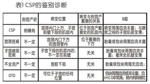 CSP患者全部都有明確的剖宮產(chǎn)史,胎囊著床在剖宮產(chǎn)瘢痕內(nèi),周圍有豐富的血流,瘢痕處肌壁變薄。在臨床工作中,CSP易與宮頸妊娠、子宮峽部妊娠、不全流產(chǎn)和滋養(yǎng)細(xì)胞疾病相混淆,需要仔細(xì)鑒別。一般通過病史、妊娠囊位置和B超檢查鑒別必要時可行血清βHCG、肺CT和病理檢查。