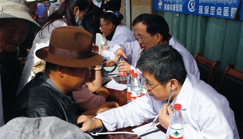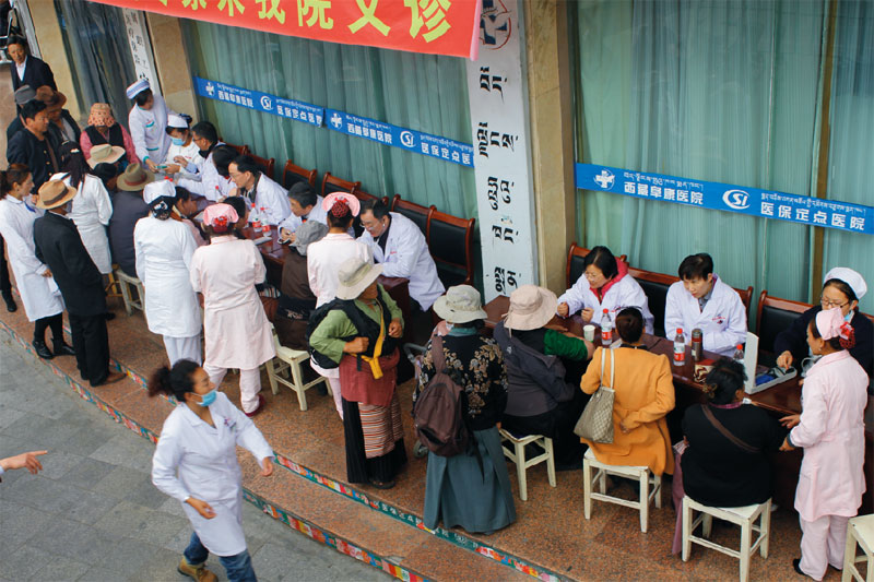2014年9月29日,8位來自內(nèi)地各大醫(yī)院的專家在娘熱路阜康醫(yī)院門口為市民義診。阜康醫(yī)院業(yè)務(wù)副院長張治說:“原本有14位專家來參加義診,可是因為幾位有高原反應,最后只有這8位老師來到現(xiàn)場。”