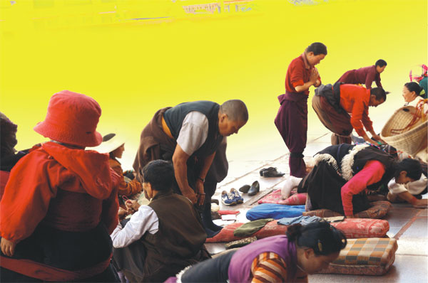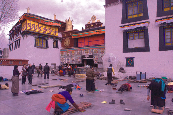 前幾天在大昭寺廣場,看人們磕長頭。人很多,其中多數應該是牧區(qū)上來的,臟亂的衣服,掩不住滿眼的虔誠。有的人累了,便坐在那里和身邊的一或兩人輕聲地說話,大多數人,則是重復著相同的動作:面向大昭寺,不停起身,然后跪倒全身俯地……從早到晚,日復一日,簡單而長久。