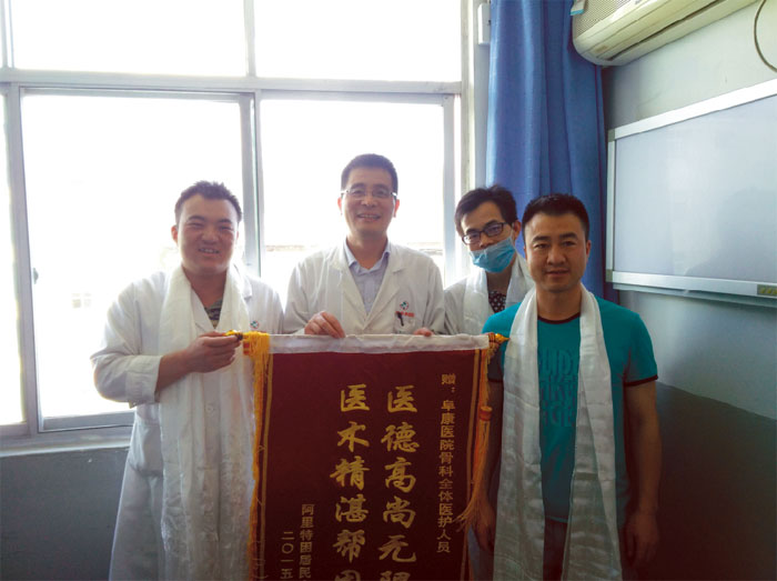 2015年5月23日,外一科收治一名來自曲樂鄉(xiāng)尼雄二村名叫扎西(化名)的病人,診斷為右脛骨開放性粉碎性骨折并大面積皮膚壞死,住院63天,共四次手術。因經(jīng)濟困難,無法承擔所欠的四萬兩千余元。向上級領導匯報后,王斌董事長指示:先治病,所欠費用由雪域天使基金會補充。出院當天,患者及家屬為我院骨科醫(yī)生獻上哈達和錦旗以表感謝之情。