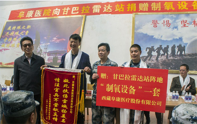 2016年5月11日,西藏阜康醫(yī)院有限公司向甘巴拉雷達站捐贈制氧設(shè)備儀式在甘巴拉雷達站營地舉行,西藏自治區(qū)政協(xié)副主席、區(qū)工商聯(lián)主席、區(qū)總商會會長阿沛·晉源,區(qū)工商聯(lián)副主席劉洪,區(qū)工商聯(lián)政研室主任張云寶,區(qū)工商聯(lián)經(jīng)聯(lián)處副處長秦林,95662部隊政治委員楊壽保,甘巴拉雷達站政治教導(dǎo)員李再華,西藏阜康醫(yī)療股份有限公司黨委書記、董事長王斌,黨委副書記、總院長張德才,黨委紀檢委員、總經(jīng)理陳彬以及甘巴拉雷達站全體官兵等出席了本次捐贈儀式。