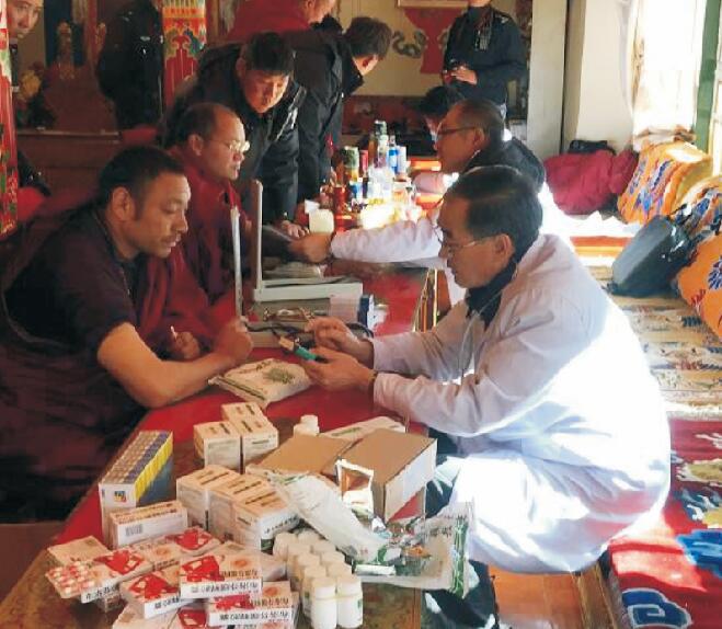 12月10日,在西藏阜康醫(yī)院名譽(yù)院長(zhǎng)、慢病管理中心主任張德才的帶領(lǐng)下一行6人前往楚布寺,義診中張?jiān)洪L(zhǎng)和田豐輝醫(yī)生負(fù)責(zé)測(cè)血壓,唐宗青測(cè)血糖,瓊瑪負(fù)責(zé)發(fā)放藥品,占堆對(duì)每一位血壓、血糖高的僧人、群眾進(jìn)行登記,張?jiān)洪L(zhǎng)根據(jù)西藏人民的生活健康狀況,對(duì)來義診人員提出《健康五大基石》。